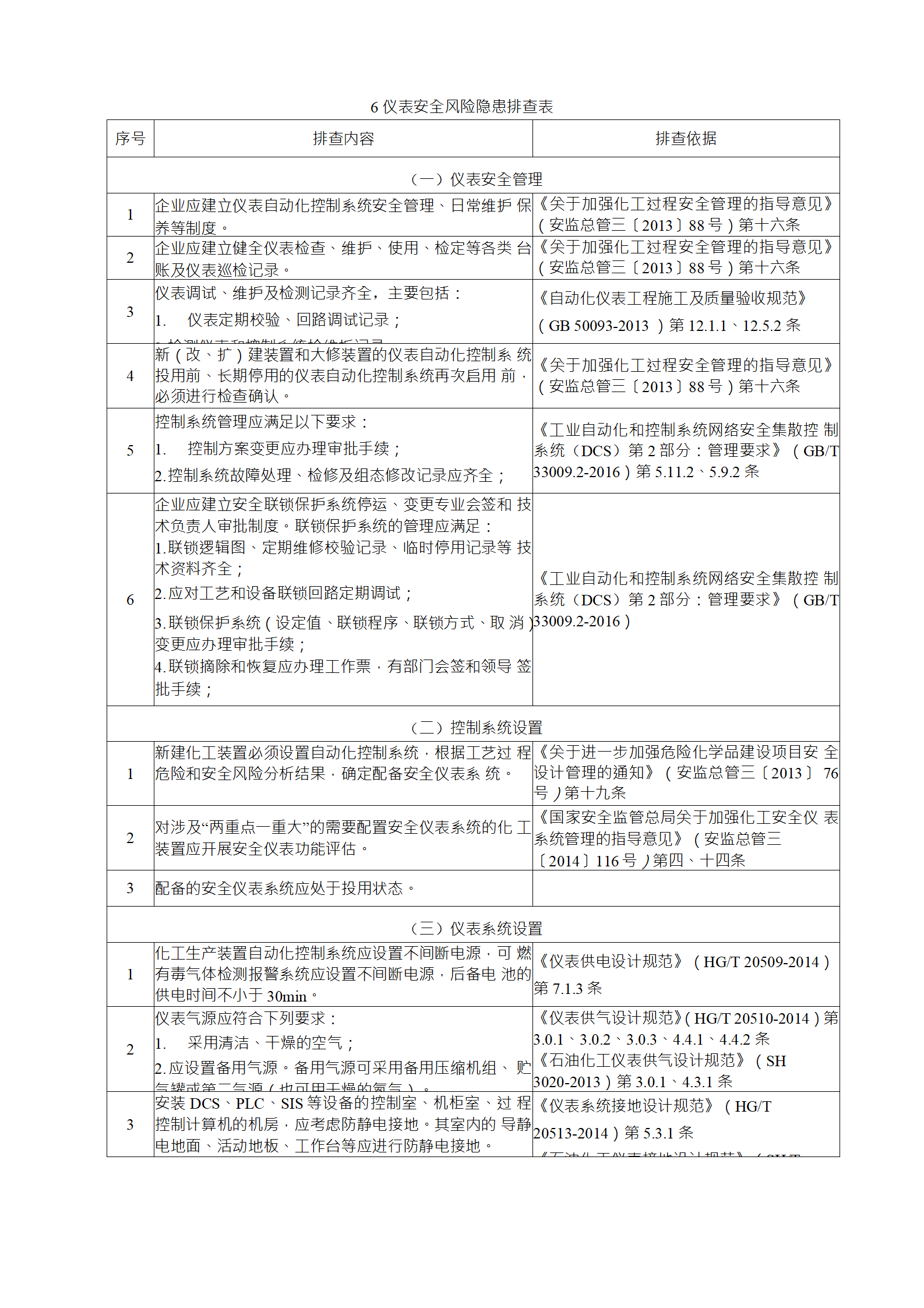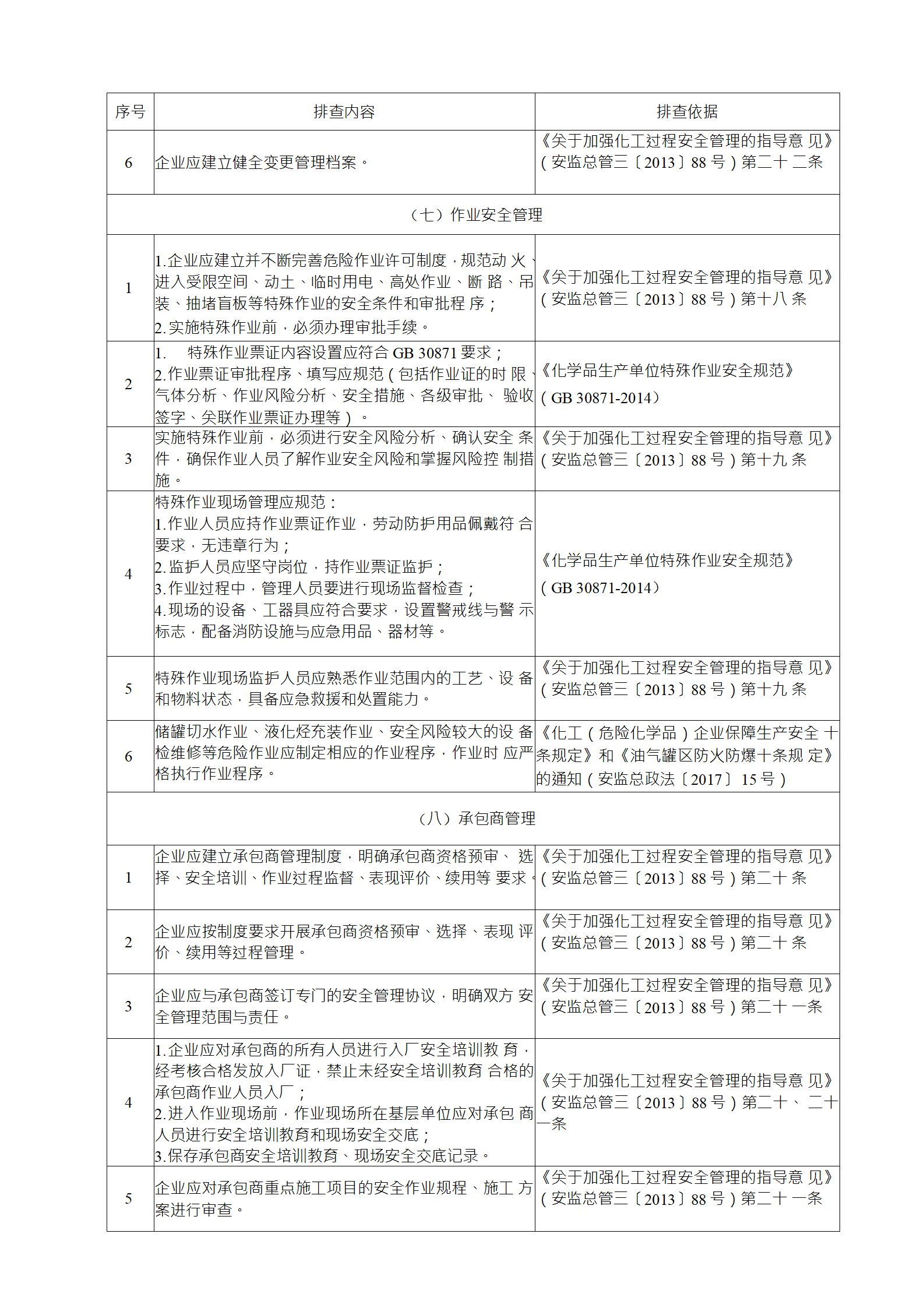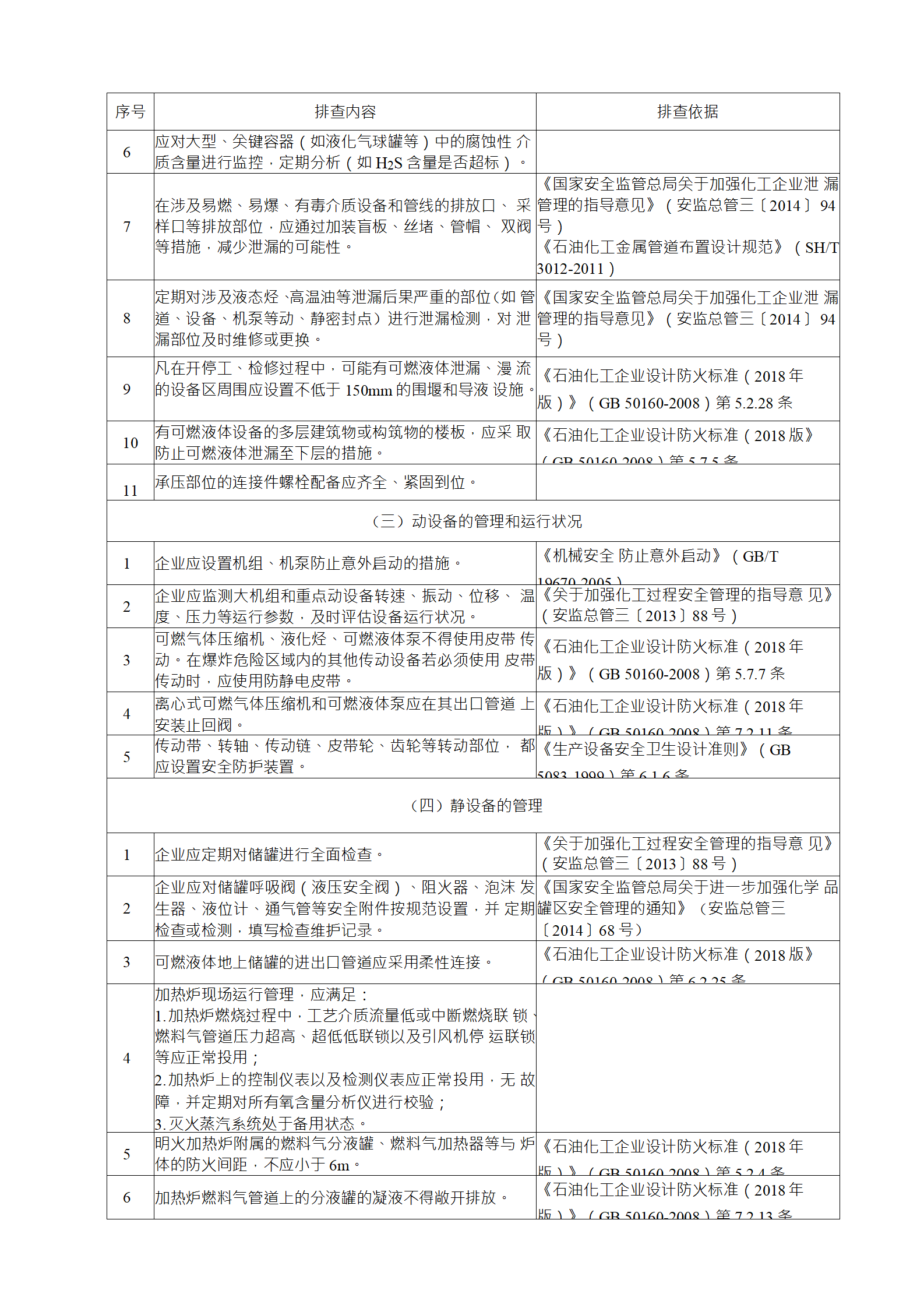 企業(yè)應(yīng)結(jié)合自身安全風(fēng)險(xiǎn)及管控水平,按照化工過(guò)程安全 管理的要求,參照各專業(yè)安全風(fēng)險(xiǎn)隱患排查表(見(jiàn)附件),編制 符合自身實(shí)際的安全風(fēng)險(xiǎn)隱患排查表,開(kāi)展安全風(fēng)險(xiǎn)隱患排查 工作。