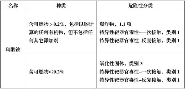 按照《危險化學品目錄》(2015年),硝酸銨分為兩種,其危險性分類有: