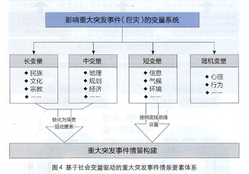 重大突發(fā)事件本身是一個(gè)復(fù)雜系統(tǒng)。當(dāng)嘗試通過“情景構(gòu)建”來(lái)表征重大突發(fā)事件的規(guī)律特點(diǎn)時(shí),按照社會(huì)物理學(xué)理論,需要對(duì)一系列社會(huì)變量進(jìn)行描述,決定重大突發(fā)事件情景的變量包含:長(zhǎng)變量(與民族、文化、宗教相關(guān)的變量)、中變量(與地理、規(guī)劃、經(jīng)濟(jì)、社會(huì)相關(guān)的變量)、短變量(與信息、氣候、環(huán)境、交通等相關(guān)的變量)、隨機(jī)變量(與心理、行為以及未知因素相關(guān)的變量)(見圖4)。為確保重大突發(fā)事件情景能夠準(zhǔn)確地代表不斷演化的國(guó)家風(fēng)險(xiǎn)(或者地區(qū)風(fēng)險(xiǎn)),情景構(gòu)建過程中,需將上面所述的長(zhǎng)變量與中變量設(shè)置為情景恒定要素,當(dāng)這兩類變量發(fā)生變動(dòng)時(shí),需要及時(shí)修訂情景;此外,關(guān)于短變量,應(yīng)該基于“底線思維”,設(shè)置可能導(dǎo)致事件往最壞方向發(fā)展的變量,這樣可以有效保證與情景所匹配的目標(biāo)能力具備“冗余”。而隨機(jī)變量,對(duì)于情景構(gòu)建來(lái)說不具備較大價(jià)值,不應(yīng)該在情景中描述。