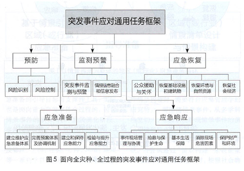 筆者所在課題組參考美國(guó)UTL的格式,對(duì)我國(guó)多災(zāi)種的應(yīng)對(duì)任務(wù)進(jìn)行了分析,提出了符合我國(guó)體制機(jī)制特點(diǎn)的突發(fā)事件應(yīng)對(duì)通用任務(wù)框架,該框架包含5類任務(wù)領(lǐng)域、17類一級(jí)任務(wù)、64類二級(jí)任務(wù)(如圖5所示)。該任務(wù)框架是面向全災(zāi)種、全過程的任務(wù)框架,無(wú)論哪種類型的突發(fā)事件情景,均可在該框架的引導(dǎo)下開展任務(wù)梳理。
