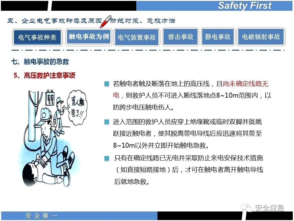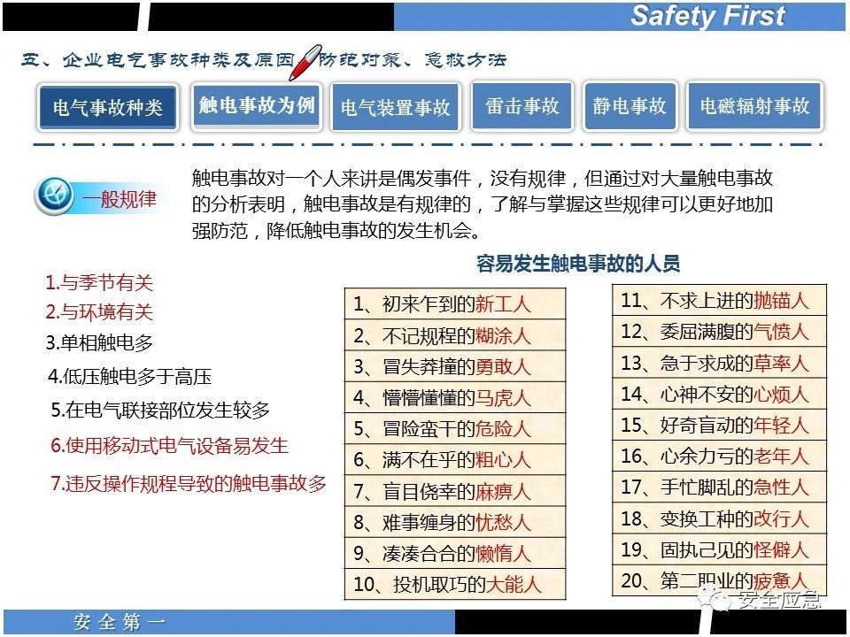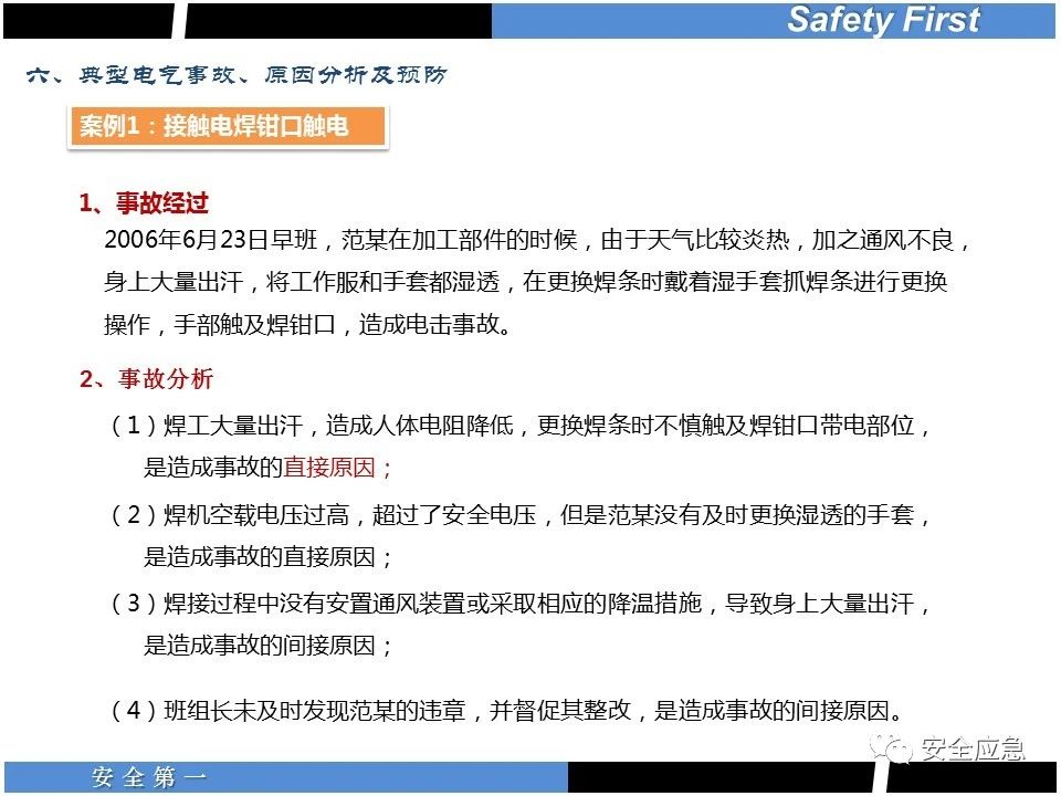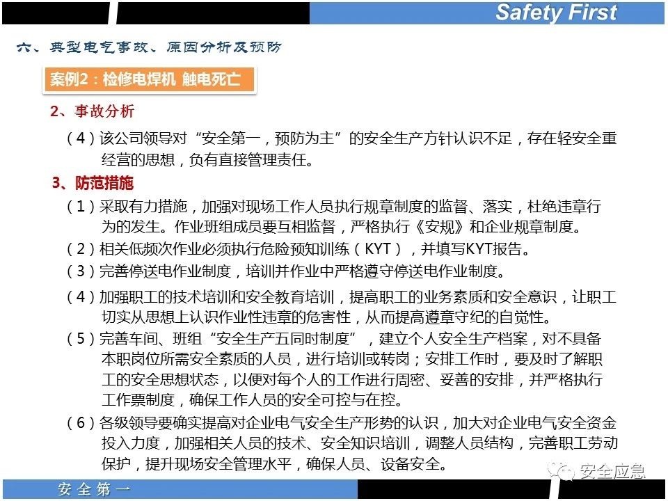 案例73 事故案例73:某35變電站準(zhǔn)備10kV避雷器試驗(yàn)。作業(yè)人員會(huì)同運(yùn)行人員準(zhǔn)備查看設(shè)備實(shí)際情況,拆卸10kV開(kāi)關(guān)柜背板螺栓,打開(kāi)了柜門(mén)上的電磁鎖,并打開(kāi)了后柜門(mén)后,作業(yè)人員探頭進(jìn)入開(kāi)關(guān)柜內(nèi)時(shí),對(duì)開(kāi)關(guān)柜放電。 其它案例見(jiàn)17、18、19、20、21、22、23、50、52。 (27)多組人員組織混亂 案例74 事故案例74:某單位開(kāi)展500kV線路停電檢修和地線融冰試驗(yàn)。1名工作人員不聽(tīng)他人勸阻,登塔拆除引流線。隨后開(kāi)展地線融冰試驗(yàn),該工作人員觸電死亡。 其它案例見(jiàn)45、46、47、48。 (28)交底不認(rèn)真 案例75 事故案例75:某工作負(fù)責(zé)人帶領(lǐng)兩名工作人員準(zhǔn)備在10kV線路裝設(shè)接地線。工作前,工作負(fù)責(zé)人沒(méi)有進(jìn)行班前(后)會(huì),沒(méi)有分配工作任務(wù),也沒(méi)有交代安全注意事項(xiàng),另外兩人也沒(méi)有主動(dòng)詢(xún)問(wèn),相互提醒,導(dǎo)致工作負(fù)責(zé)人無(wú)監(jiān)護(hù)誤登運(yùn)行線路,造成觸電。 其它案例見(jiàn)32。 (29)監(jiān)護(hù)不到位 l 單人工作無(wú)監(jiān)護(hù) 事故案例:36。 l 監(jiān)護(hù)人參與工作 事故案例:11。 l 監(jiān)護(hù)不認(rèn)真,或默許違章行為 事故案例:67。 (30)人員、工作安排不恰當(dāng) 案例76 事故案例76:某供電所安排不具備單獨(dú)工作資格和能力的新入廠員工上桿進(jìn)行配變?cè)O(shè)備搶修工作,由于安全距離不夠,員工經(jīng)驗(yàn)不足,監(jiān)護(hù)不到位,導(dǎo)致觸電。 案例77 事故案例77:某高壓試驗(yàn)班開(kāi)展定檢預(yù)試作業(yè)。工作負(fù)責(zé)人與工作人員在抄錄放電計(jì)數(shù)器銘牌,另一名剛參加工作不久的工作人員拿著自制試驗(yàn)線插入移動(dòng)電源盤(pán)插座內(nèi),然后,用左、右手分別拿住兩個(gè)鱷魚(yú)夾準(zhǔn)備對(duì)放電器搭接做試驗(yàn),左、右手習(xí)慣性的分別握住了兩個(gè)鱷魚(yú)夾的導(dǎo)體部分,此時(shí)電流通過(guò)人體,漏電保護(hù)器沒(méi)有動(dòng)作,觸電死亡。 (31)單人作業(yè) l 野外單人巡線、勘察 案例78 事故案例78:某單位開(kāi)展線路巡視時(shí),單人作業(yè),在被告知“巡視完N58塔后切勿過(guò)江,要沿原路返回”的情況下,仍然獨(dú)自一人違規(guī)游泳過(guò)江,溺水身亡。 案例79 事故案例79:某單位野外勘察時(shí),某工作人員在未告知工作負(fù)責(zé)人的情況下,獨(dú)自一人返回車(chē)輛所在地,途中墜落懸崖暈倒,受輕傷并失蹤12小時(shí)。 附件:最全面的電氣安全培訓(xùn),實(shí)用!