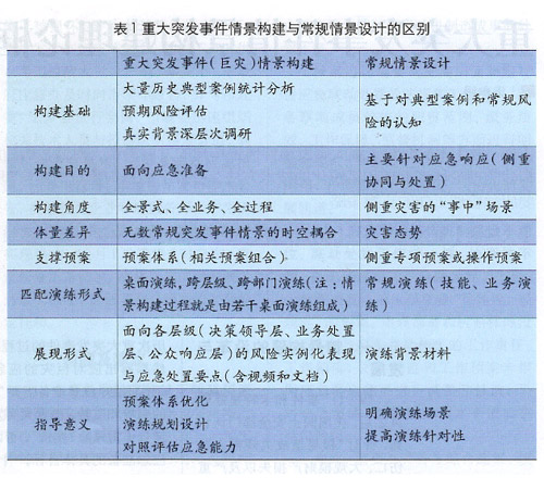 在傳統(tǒng)應(yīng)急管理中,實(shí)戰(zhàn)演練之前往往開展情景設(shè)計(jì),常規(guī)情景設(shè)計(jì)與重大突發(fā)事件情景構(gòu)建無(wú)論在研究體量、研究目的,還是研究意義都存在著一定的差異,如表1所示。