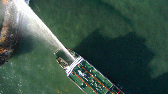 舟山隊(duì)“中化應(yīng)急”號救援船撲救著火油船