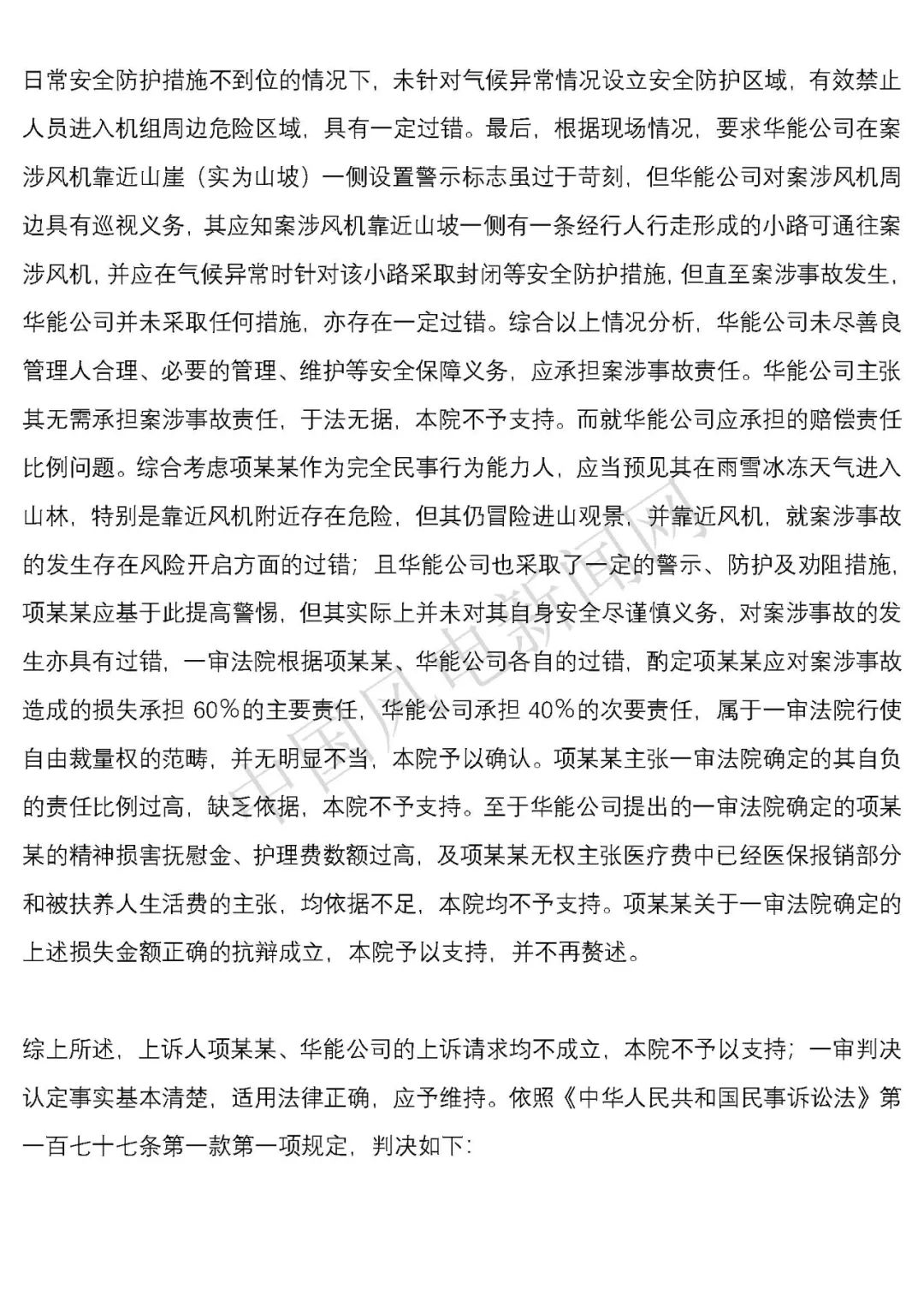 法院判決:一、華能云和風力發(fā)電有限公司于判決生效之日起十日內賠償項建英損失182934.09元;二、華能云和風力發(fā)電有限公司于判決生效之日起十日內賠償項建英精神撫慰金8000元;三、駁回項建英其他訴訟請求。