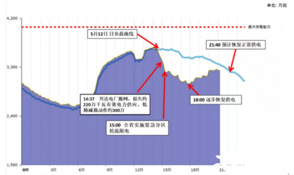5月13日14時37分,興達電廠因接入345千伏路北變電站母線故障,導致電廠電力送出受阻,兩臺燃煤及兩臺燃氣機組脫網(wǎng),系統(tǒng)損失有效電力供應約220萬千瓦,造成臺灣系統(tǒng)頻率驟降,為維持電網(wǎng)穩(wěn)定,電力系統(tǒng)在第一時間自動啟動低頻卸載約300萬千瓦。臺電評估短時間內無法立即復電,為維系電力系統(tǒng)安全,自下午3時起執(zhí)行緊急分區(qū)輪流停電,最大限電達到350萬千瓦。事故過程系統(tǒng)負荷變化曲線下圖所示。
